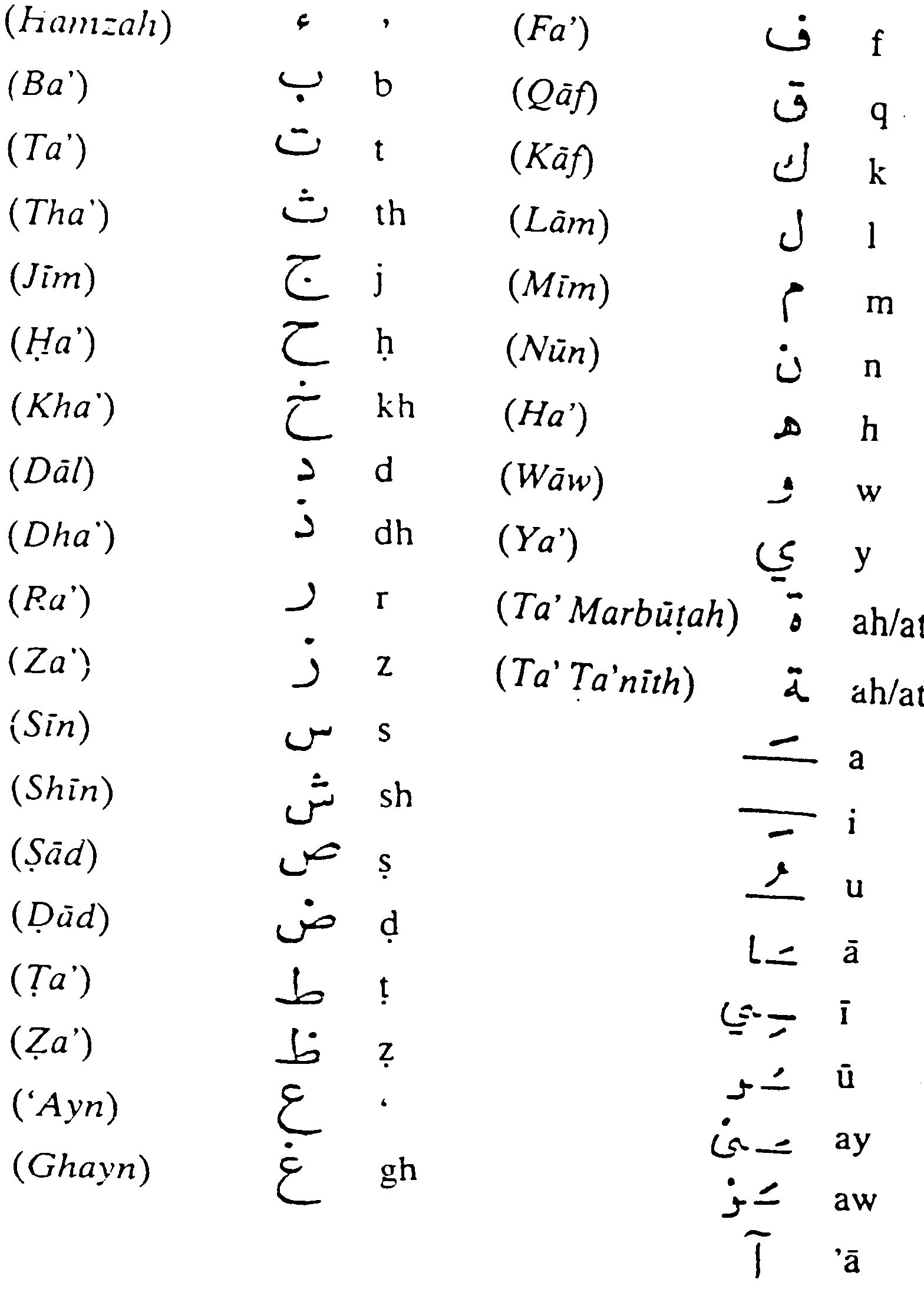 2/ For those who have no access to an Arabic al phabet, and the accompanying transliteration of those letters that is in general use, and will accompany some of our examples, we reproduced what is found in Qur’anic Arabic by M. I. Surty (see at right).