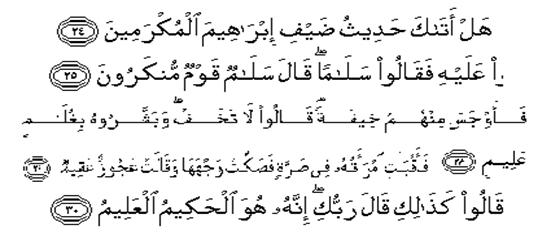 เรื่องราวของแขกผู้มีเกียรติของอิบรอฮีมได้มาถึงเจ้าบ้างไหม      เมื่อพวกเขาได้เข้ามาหาอิบรอฮีม พวกเขากล่าวว่า ศานติ อิบรอฮีมกล่าวตอบว่า ศานติ พวกท่านเป็นหมู่ชนที่แปลกหน้าเมื่อพวกเขาไม่กินอาหาร ดังนั้นอิบรอฮีมรู้สึกกลัวพวกเขา พวกเขากล่าวว่า อย่ากลัวเลยและได้แจ้งข่าวดี แก่อิบรอฮีมเกี่ยวกับลูกคนหนึ่งที่มีความรู้ แล้วภริยาของอิบรอฮีมก็ได้ออกมาตะโกน พลางตบหน้าของนาง แล้วกล่าวว่า “หญิงแก่เป็นหมัน” พวกเขากล่าวว่าเช่นนั้นแหละ พระเจ้าของเธอได้ตรัสไว้เช่นนั้น แท้จริงพระองค์ทรงเป็นผู้ปรีชาญาณยิ่ง ผู้ทรงรอบรู้เสมอ