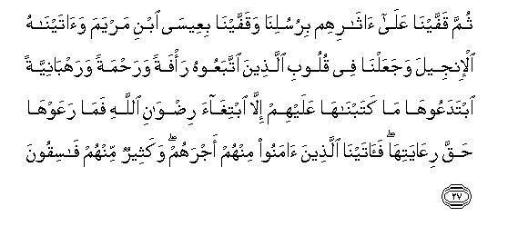 แล้วเราก็ได้ส่งบรรดาร่อซู้ลของเราติดตามร่องรอยของพวกเขา  และเราได้ส่งอีซาอิบนฺมัรยัมตามมา และเราได้ประทานอินญีลให้แก่เขา และเราได้บันดาลความสงสาร และความเมตตาให้เกิดขึ้นในจิตใจของบรรดผู้ที่เชื่อฟังปฏิบัติตามเขา