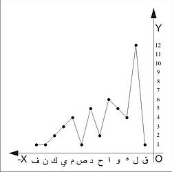 Для начала отметим, что так же, как и автор первого графика, Юсуф Керкуку выбрал координатный угол, который не соответствует ни математическим законам, ни направлению арабской письменности. Даже если согласиться с выбором Юсуфа и построить график в квадранте II, то выглядеть он должен так, как на рисунке справа. По законам геометрии сначала откладывается абсцисса, а затем ордината точки. То есть арабские буквы должны располагаться по оси абсцисс (оси иксов), а число, обозначающее количество повторов каждой буквы - по оси ординат (оси игриков). Точки должны соединяться в порядке построения.